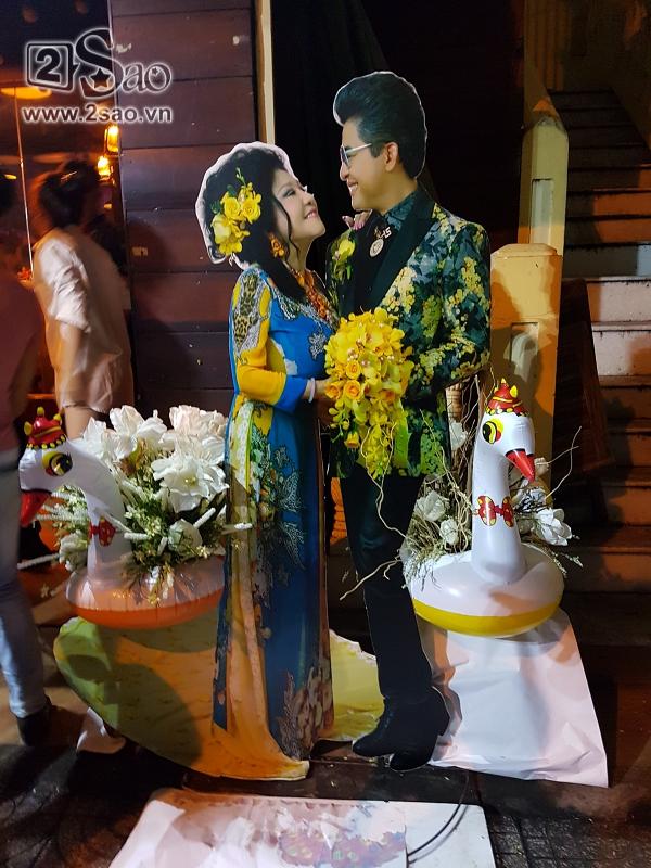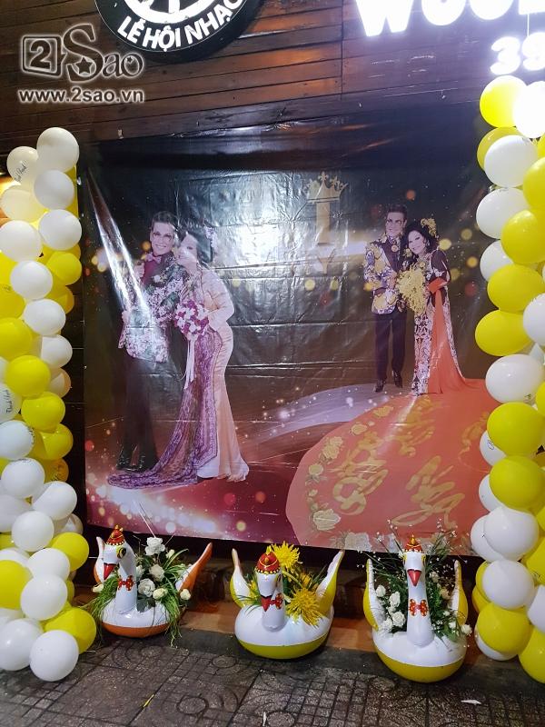 Quang cảnh bên trong quán bar tổ chức tiệc cưới được trang trí khá đơn giản, ngoài ra, khách mời cũng được đãi bánh ú, cherry và bánh ngọt được cắt ra từ bánh cưới của cặp đôi. Trong giây phút đầy hạnh phúc, MC Thanh Bạch cầm tay nữ đại gia Thúy Nga cùng cắt bánh.