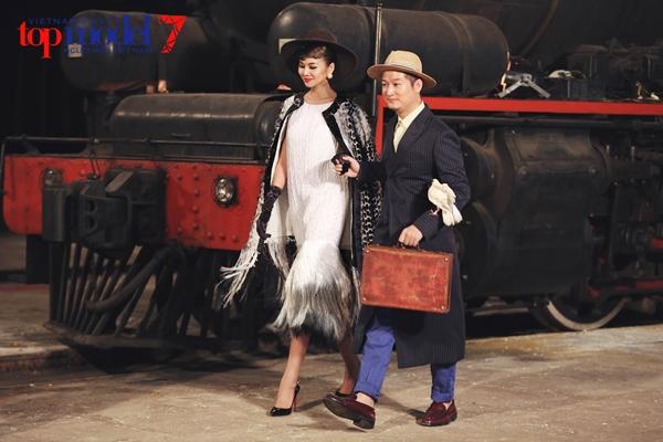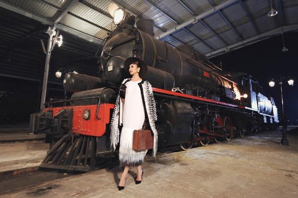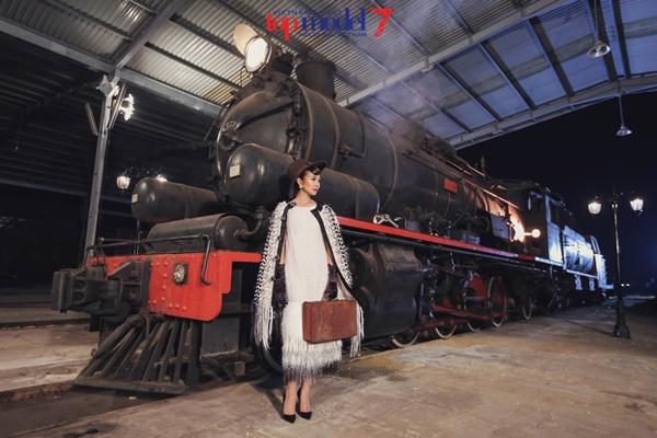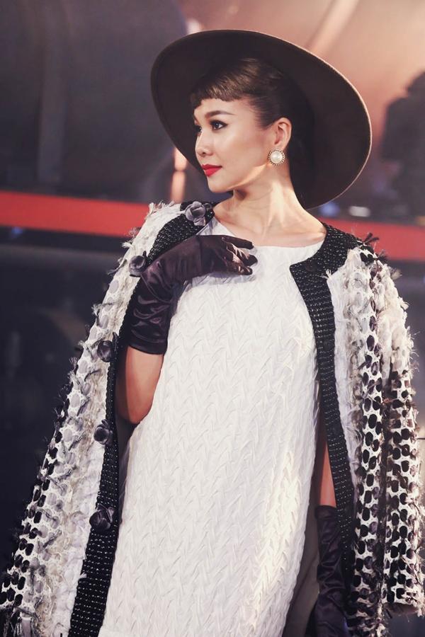 Thanh Hằng hoá thân thành cô gái của thập niên 50-60 cổ điển nhưng không kém phần lãng mạn với chiếc váy trắng tinh khôi có phần tua rua bên dưới, thêm vào đó là chiếc áo khoác màu sắc đen trắng rất hợp tông với chiếc váy. Chân dài còn lựa chọn một đôi găng tay, nón fedora và vali nhỏ hình hộp để tôn lên vẻ sang trọng cho set đồ.