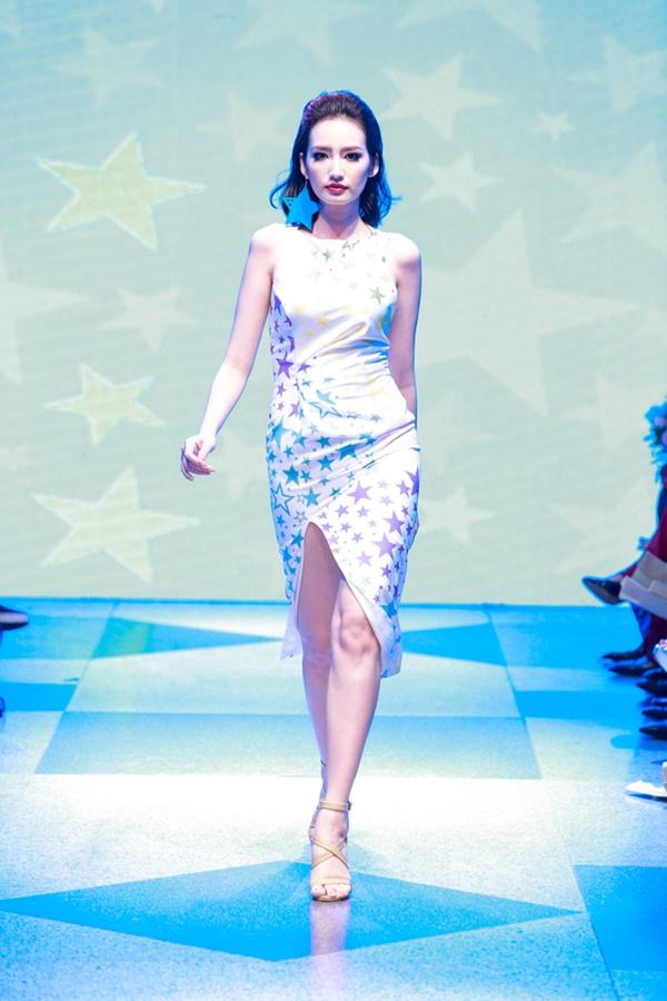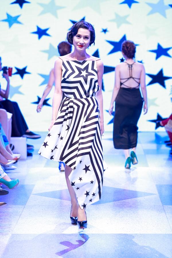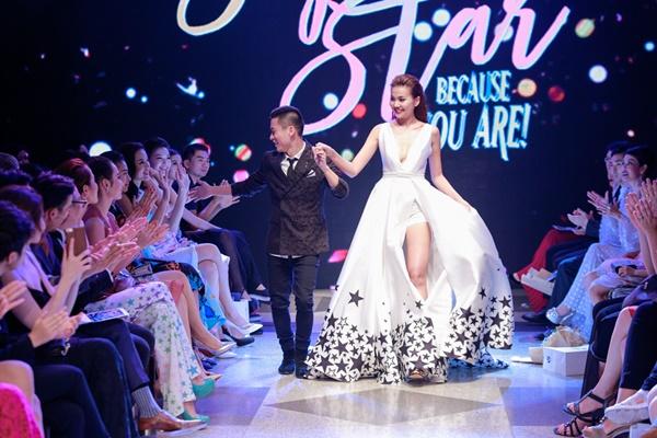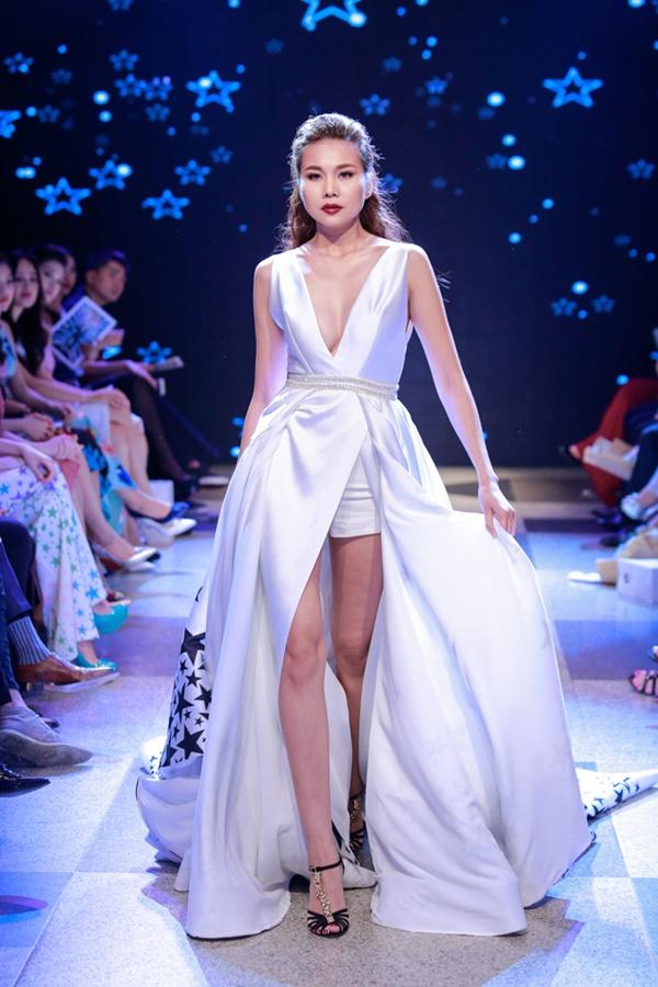 Siêu mẫu Thanh Hằng xuất hiện ở vị trí vedette, cô diện chiếc váy làm từ 25m vải