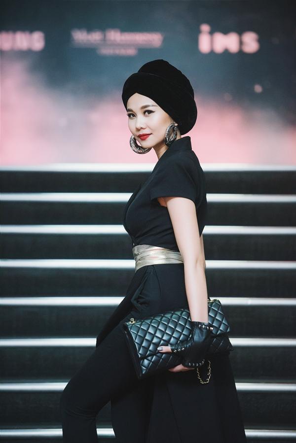 Kết hợp cùng bộ trang phục của Linh Nga là giày cao gót cùng tông màu của Christian Louboutin, hoa tai ánh kim nổi bật và chiếc ví cầm tay sang trọng của Shanghai Tang có giá khá đắt. Vẻ ngoài vừa thanh lịch nhưng vừa gợi cảm của Linh Nga khiến người đối diện không thể rời mắt.
