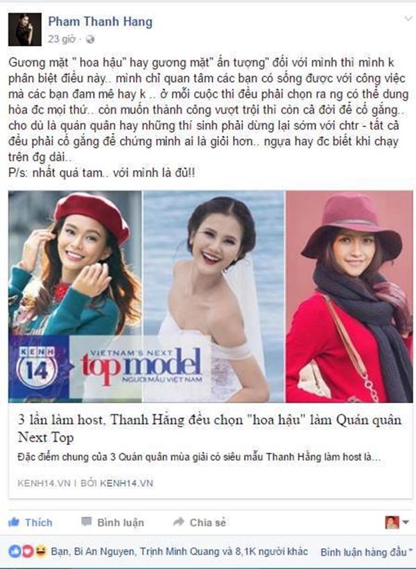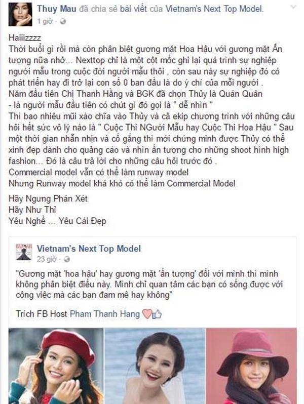 Sau khi cô nàng đăng quang, đã xuất hiện rất nhiều ý kiến trái chiều cho rằng cô thật sự không phù hợp trở thành quán quân. Ngay sau đó, Siêu mẫu Thanh Hằng đã có những chia sẻ “bênh vực” cô học trò của mình: