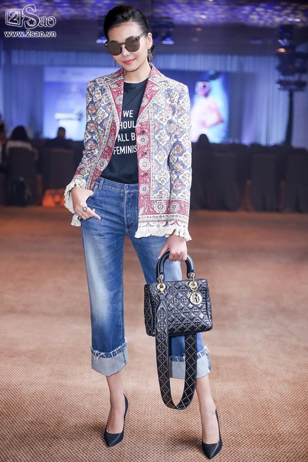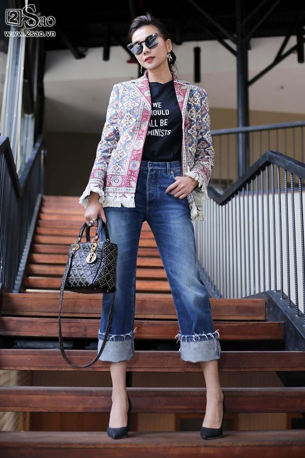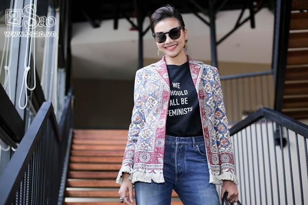 Trải qua cường độ làm việc dày đặc, Thanh Hằng vẫn giữ được vẻ đẹp rạng rỡ và thần thái sang chảnh. Siêu mẫu diện set đồ trẻ trung với quần jeans xắn gấu, áo thun phối cùng vest tua rua họa tiết thổ cẩm vô cùng lạ mắt.