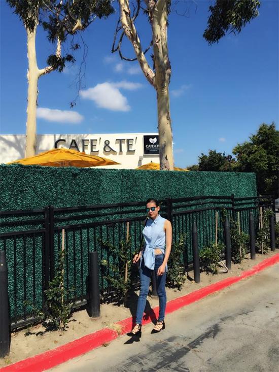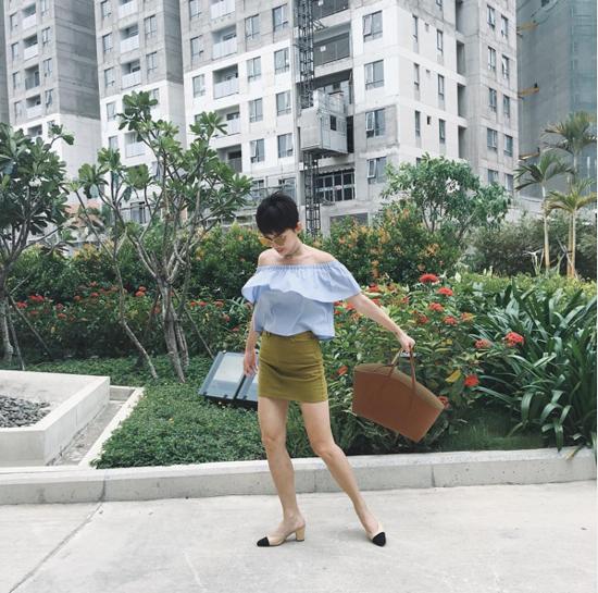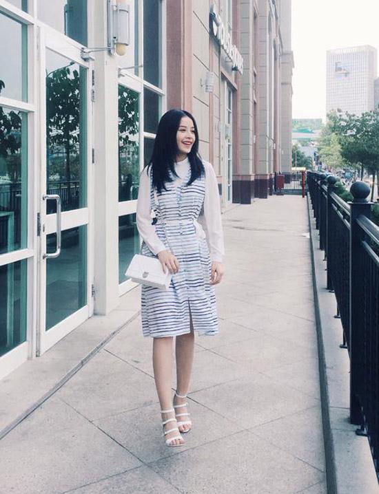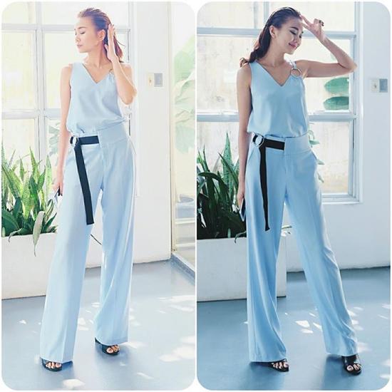 Bộ trang phục màu xanh của Thanh Hằng rất phù hợp cho những ngày đi dạo phố