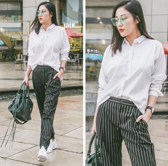 Văn Mai Hương thể hiện "chất thời trang" với quần tây kẻ sọc, áo sơ mi trắng,