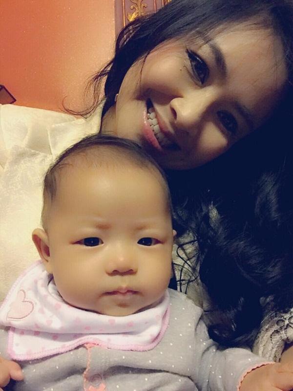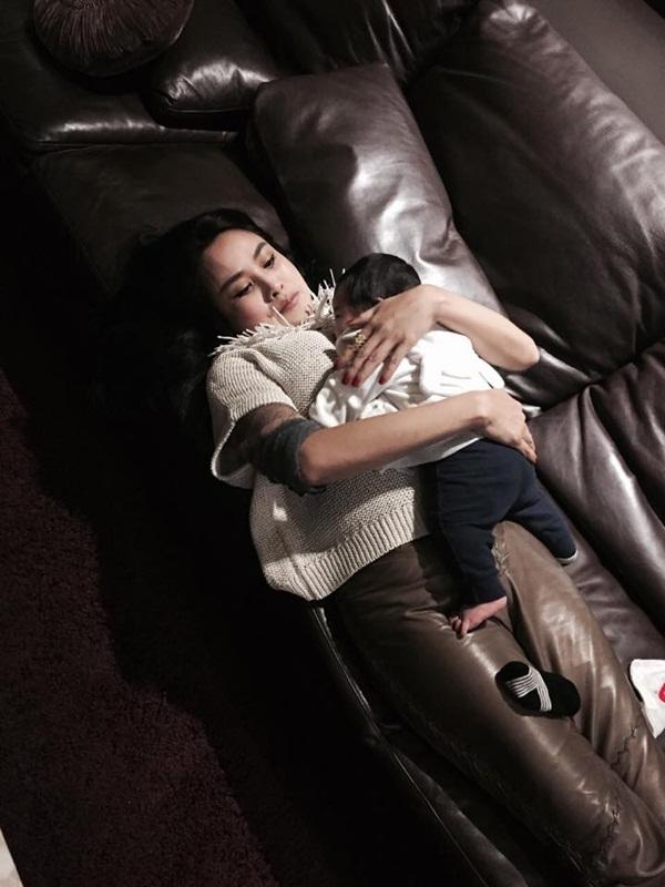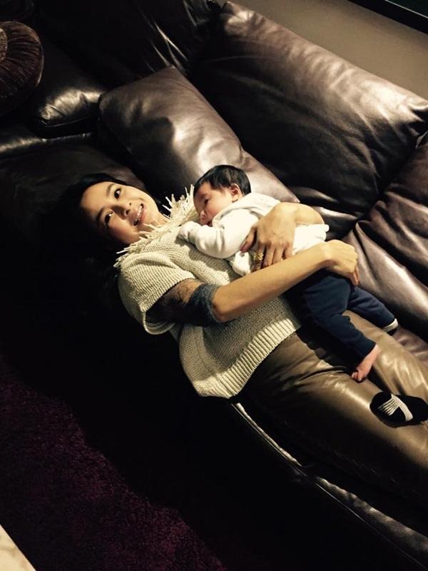Trong bộ đồ ở nhà giản dị, mãi tóc buộc rối cùng nụ cười rạng rỡ khi bế ẵm, chơi đùa với