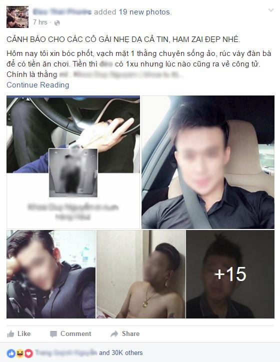 Liên lạc với Đ.T.P - chủ nhân của status này, anh chàng kể lại: "K và mình quen nhau trên mạng xã hội, rồi chơi cùng 1 hội. Sau này vì biết K lừa gạt tình cảm, lợi dụng tiền bạc nên mới quyết định công khai mọi việc. K có 1 CMND ghi sinh năm 1995, quê gốc ở Bình Định, nhưng lại tự nhận mình sinh năm 90, 91, nhà ở quận Nhớt ngoài đời. "Nghề" của K là chuyên đi ăn bám con gái".