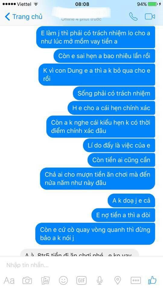 P. là người trực tiếp cho K. vay tiền khá nhiều lần, nhưng K. luôn tìm cách lần lữa, không chịu trả. Khi P. yêu cầu thời gian cụ thể thì K. lờ đi và nói sang chuyện khác. Cuối cùng là đến thời gian hẹn cũng không thấy K. xuất hiện, inbox thì không trả lời.