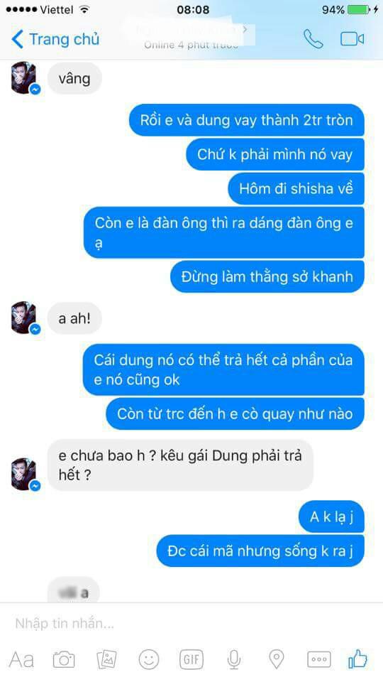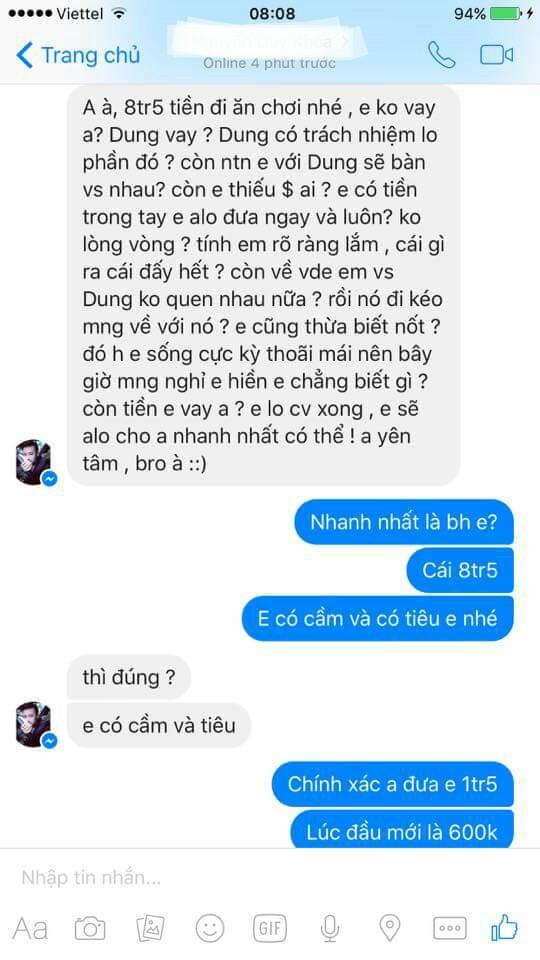 "Nó lấy thẻ tín dụng của em tôi đi mua quần áo, giầy dép cho nó, đi mời gái cafe ... Mà thẻ tiêu gì thì nó gửi tin nhắn thanh toán mà... Xong về nó nói dối là đi bar mua chai rượu tặng bạn nó..."