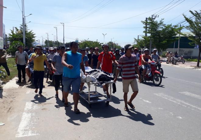 Người nhà đưa thi thể anh Đê đi trên đường Nguyễn Văn Cừ, TP Phan Rang - Tháp Chàm. Ảnh: Tuấn Kiệt.