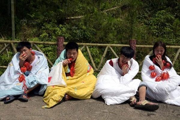 Theo thông tin đăng tải, vừa qua nhiệt độ ở Quảng Đông thường xuyên trên 38 độ, cái nắng oi bức, ngột ngạt thiêu đốt vạn vật. Trong khi người ở thành phố chỉ muốn ngồi điều hòa bấm điện thoại, người ở nông thôn chỉ muốn dầm mình trong nước cả ngày thì nhóm thanh niên này rủ nhau lên núi, quấn chăn và thi ăn ớt để... gần gũi với môi trường.