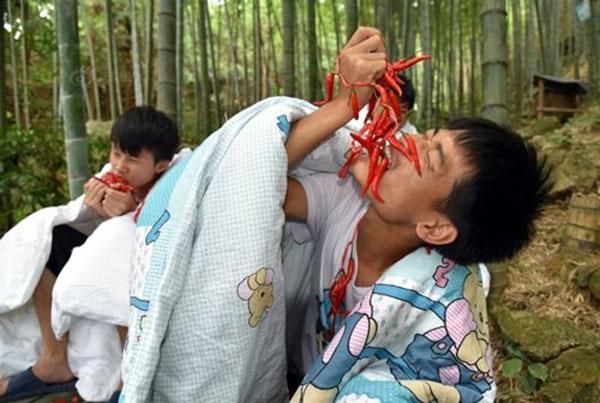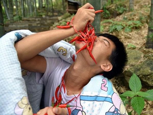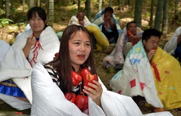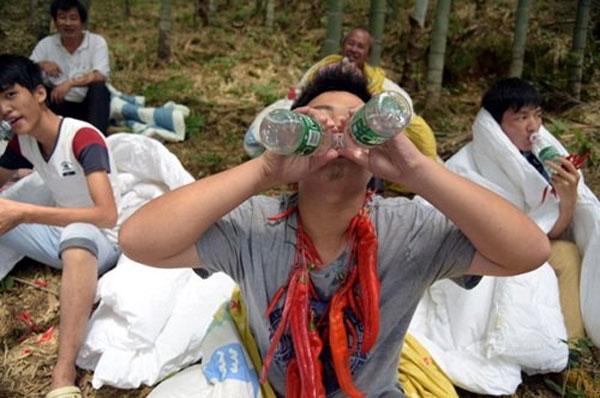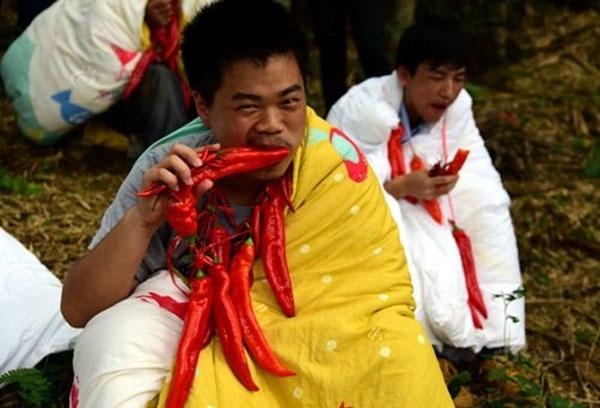 Nhóm thanh niên này cùng nhau vác chăn bông ra quấn chặt lấy thân mình, cổ đeo một chuỗi ớt cay đã chín đỏ, thi xem ai ăn được nhiều và giữ vững tinh thần được lâu nhất. Bên cạnh những người trẻ, có cả một số người trung niên tham gia hoạt động có tính thử thách cao độ này.