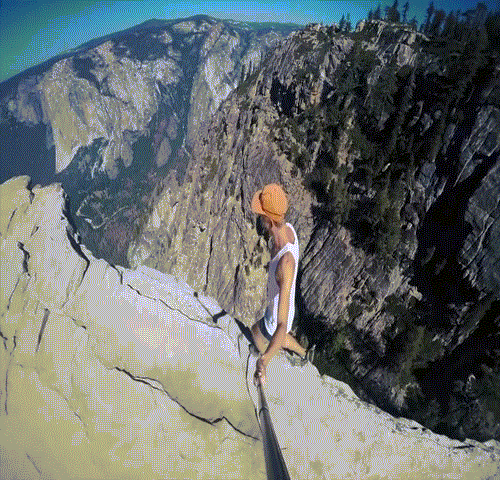 Với cây gậy tự sướng trên tay, chàng trai vô tư chạy nhảy bên rìa vách đá, thành cầu hay đi bộ ở thành vách đá cao gần 1.000 m cùng thác nước hùng vĩ.