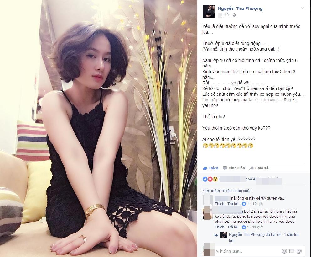 Trích dòng trạng thái mới đây của vợ cũ Thành Trung - Thu Phượng: "Yêu là điều tưởng dễ với suy nghĩ của mình trước kia. Thuở lớp 8 đã biết rung động vài mối tình thơ, ngây ngô, vụng dại. Năm lớp 10 đã có mối tình đầu chính thức gần 6 năm. Sinh viên năm thứ 2 đã cá mối tình thứ 2 hơn 3 năm, rồi...và đổ vỡ. Kể từ đó...chữ 'yêu' trở nên xa xỉ đến tận bây giờ: lúc có chút cảm xúc thì thấy không hợp - không muốn yêu, lúc gặp người hợp mà không có cảm xúc ...cũng không yêu nổi. Thế là như thế nào? Yêu thôi mà, có cần khó vậy không? Ai cho tôi tình yêu?".