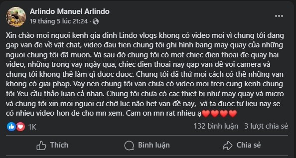 Gần đây, sau khi Quang Linh Vlog bị tạm giam, anh liên tục có bài viết, chia sẻ những chật vật, khó khăn mà bản thân đang gặp phải suốt thời gian qua. Theo đó, một thành viên cũ từng hỗ trợ quay phim, dựng video cho Lindo trở về Việt Nam lấy vợ nên cả 2 đã "đường ai nấy đi" khiến việc làm video của anh bị tạm ngưng một thời gian.