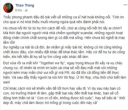 Thái Trinh và Thảo Trang đã thẳng thắn bày tỏ quan điểm của bản thân về nghiệp cầm ca và quan điểm làm nghề trên Facebook cá nhân sau khi thấy mình được liệt kê vào danh sách "những ca sĩ hát mãi không nổi".