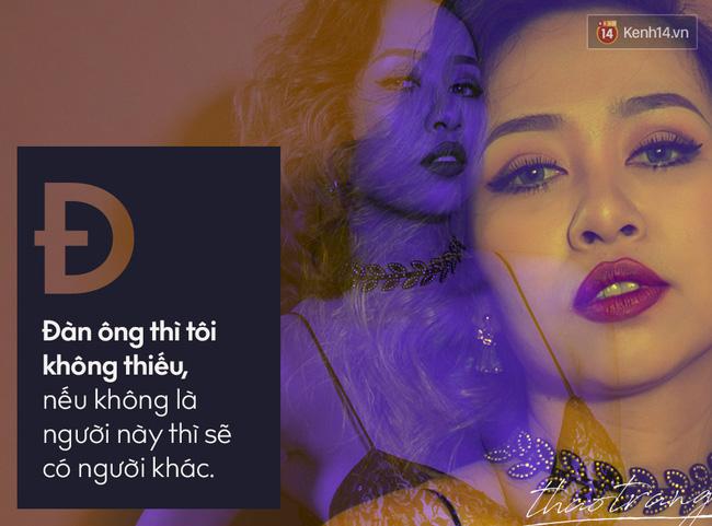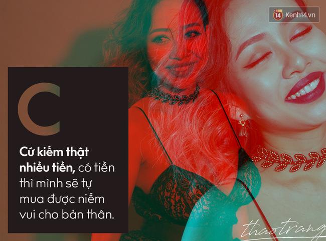 Bây giờ, tôi quyết định rằng mình cứ kiếm thật nhiều tiền, có tiền thì mình sẽ tự mua được niềm vui cho bản thân, để đàn ông người ta không khinh. Tôi thấy có nhiều phụ nữ xung quanh mình có chồng giàu, nhiều tiền nhưng họ lại mất đi tự do. Cái gì cũng có giá của nó, bản thân tôi chọn lối sống thực dụng, mình tự làm ra tiền mình tự hưởng. Nếu ai đó đồng cảm thì có thể sống cùng, nếu không thì mời ra, mình vẫn sống tốt và không bị phụ thuộc vào ai cả.