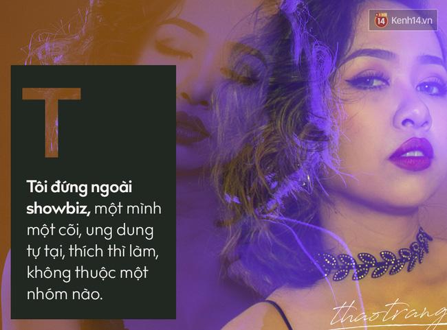 Đi ngược lại quan điểm của đám đông, xem mình là một cá thể đặc biệt, Thảo Trang hiển nhiên cảm thấy rõ nét mình là một phần rất nhỏ trong môi trường showbiz. Danh xưng này mang đến một ấn tượng trong lòng khán giả, khiến họ nhớ đến cô nhiều hơn, nhưng đồng thời cũng hạn chế một số cơ hội trong công việc.