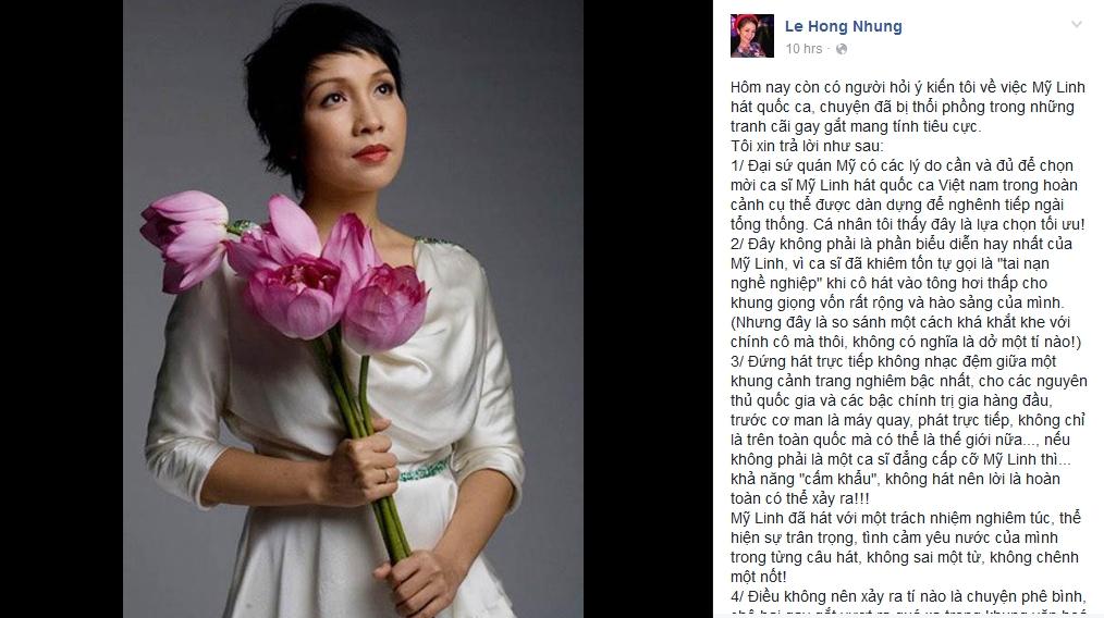"Đại sứ quán Mỹ có các lý do cần và đủ để chọn mời ca sĩ Mỹ Linh hát quốc ca Việt nam trong hoàn cảnh cụ thể được dàn dựng để nghênh tiếp ngài tổng thống. Cá nhân tôi thấy đây là lựa chọn tối ưu! ", cô giải thích lí do vì sao Mỹ Linh lại được chọn để trình diễn trước Tổng thống Obama trong ngày hôm đó.