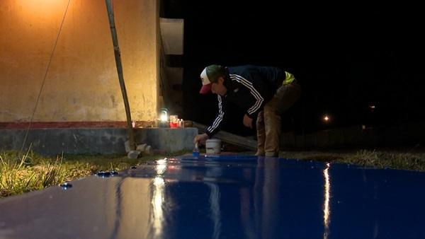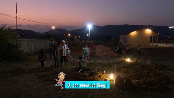 lao ngay vào phụ giúp bố Xuân Bắc thắp điện cho các chú công nhân làm việc.