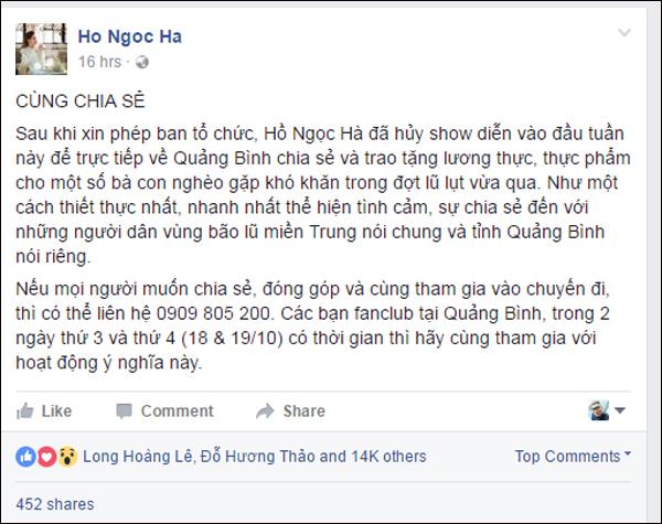 Trên fanpage chính thức, nữ ca sỹ Hà Hồ có những lời ấm áp với tựa đề Cùng Chia sẻ: "Sau khi xin phép ban tổ chức, Hồ Ngọc Hà đã hủy show diễn vào đầu tuần này để trực tiếp về Quảng Bình chia sẻ và trao tặng lương thực, thực phẩm cho một số bà con nghèo gặp khó khăn trong đợt lũ lụt vừa qua. Như một cách thiết thực nhất, nhanh nhất thể hiện tình cảm, sự chia sẻ đến với những người dân vùng bão lũ miền Trung nói chung và tỉnh Quảng Bình nói riêng..."