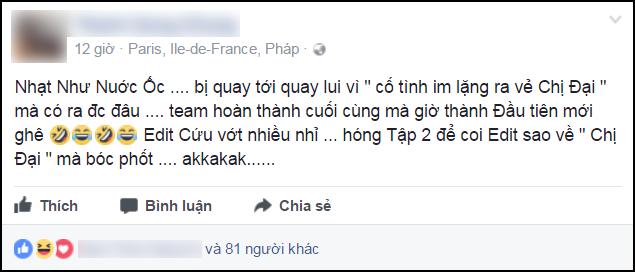 "Nhạt như nước ốc. Bị quay tới quay lui vì 'cố tình im lặng ra vẻ chị Đại' mà có ra được đâu. Team hoàn thành cuối cùng mà giờ thành đầu tiên mới ghê. Chỉnh sửa cứu vớt nhiều nhỉ. Hóng tập 2 coi coi edit sao về 'chị Đại' để bóc phốt", nhà tạo mẫu tóc của Minh Tú viết.