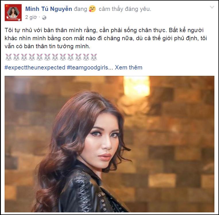 Hiện Minh Tú vẫn chưa chưa chính thức lên tiếng về vấn đề này. Tuy nhiên, dòng trạng thái được đăng tải trên trang cá nhân của người đẹp cách đây ít giờ được khán giả cho rằng đáp trả lại pha dàn dựng lộ liễu, khiến cô phải chịu tiếng cắn đích muộn.