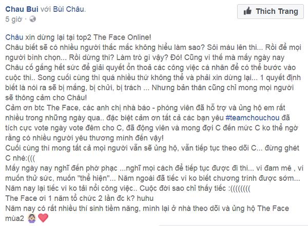 "Mấy ngày nay Châu cố gắng hết sức để giải quyết ổn thoả các công việc cá nhân để có thể bước vào cuộc thi. Song cuối cùng thì quá nhiều thứ không thể và phải xin dừng lại. Một quyết định biết là nói ra sẽ bị mắng, bị chửi, bị trách..., nhưng bản thân cũng chỉ mong mọi người sẽ thông cảm", hotgirl họ Bùi viết.
