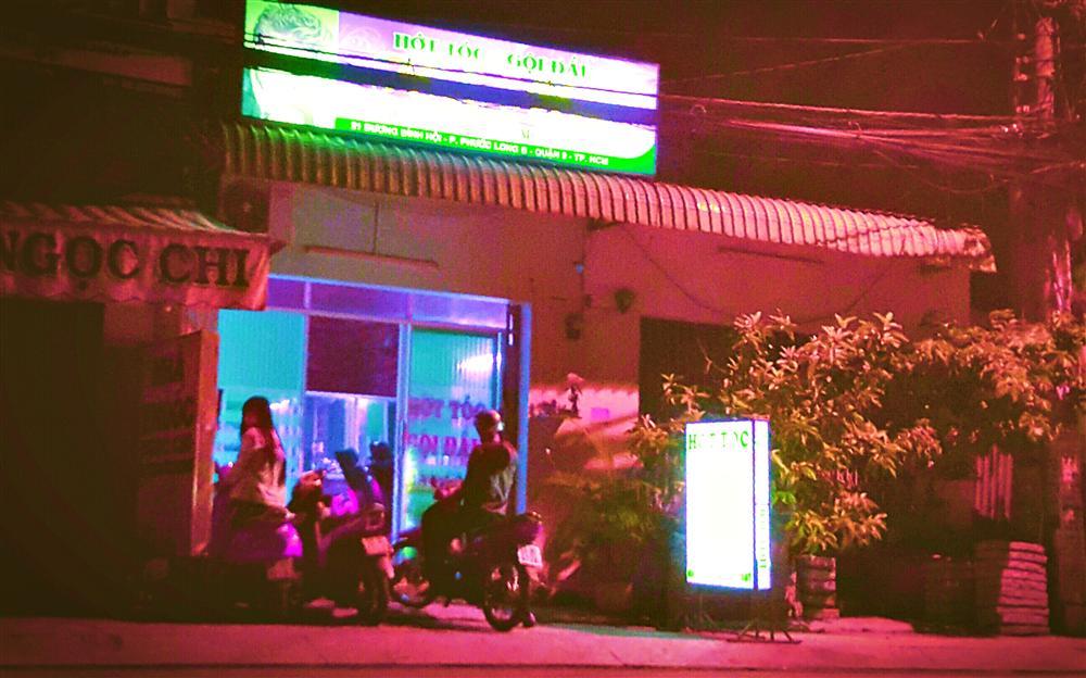 Các nữ tiếp viên của một tụ điểm kích dục trá hình tiệm hớt tóc nằm trên đường Dương Đình Hội, Q9 đang đón khách. Ảnh: Diệp Khiết.