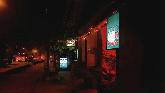 Khung cảnh đèn mờ bên ngoài quá cà phê Yến Nhi (đường Nguyễn Thị Định, Q2). Đây cũng là đặc điểm nhận dạng chung của các quán xá trá hình nằm trên con đường này. Ảnh: Hoàng Đạt – Huỳnh Văn.