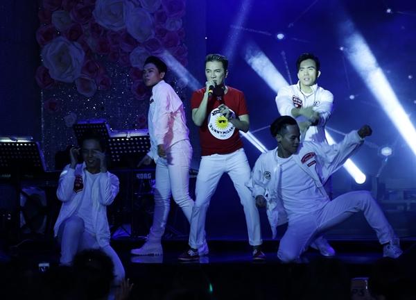 Người đồng nghiệp lâu năm của Mr Đàm, ca sỹ Vũ Hà diện nguyên cây đen, anh khiến khán phòng sôi động với hai ca khúc nhạc dance: Về Đây Em; Mambo Nồng Say.