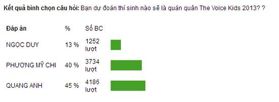 23h22: Nguyễn Quang Anh chính thức trở thành Quán quân The Voice Kids 2013 với 215,905 phiếu bình chọn từ phía khán giả. Phương Mỹ Chi và Ngọc Duy trở thành Á quân Giọng hát Việt nhí mùa đầu tiên