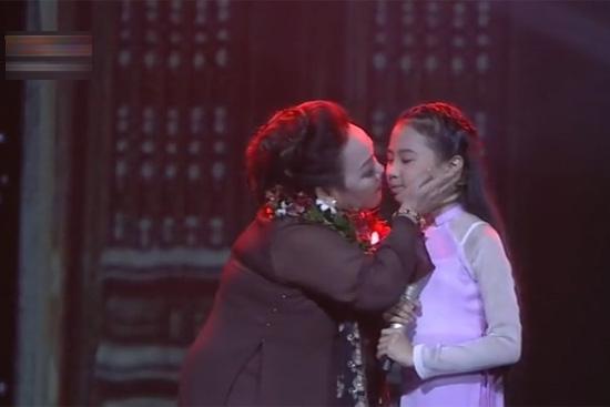 NSƯT Ngọc Giàu biểu diễn và hôn yêu quý Mỹ Chi trước tiết mục của cô bé.