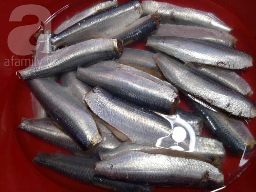 Cá trích làm sạch, bỏ đầu, bỏ lườn, móc sạch bụng, làm sạch vẩy rồi ngâm với nước muối loãng cho cá cứng thịt.