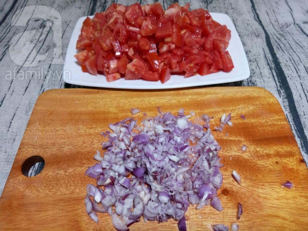 Cà chua rửa sạch thái nhỏ hạt lựu, hành tím thái mỏng rồi băm nhuyễn.