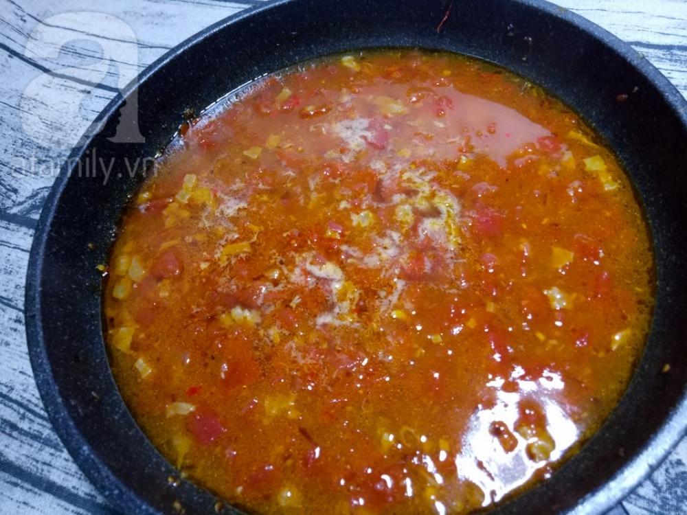 Sau đó cho cà chua vào xào cùng với gia vị muối, đường, nước mắm, bột nêm vào. Tiếp đó, cho nước dừa tươi vào khi hỗn hợp nước sốt cà sôi nhẹ lên thì nêm nếm gia vị vừa ăn rồi tắt bếp.