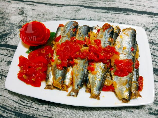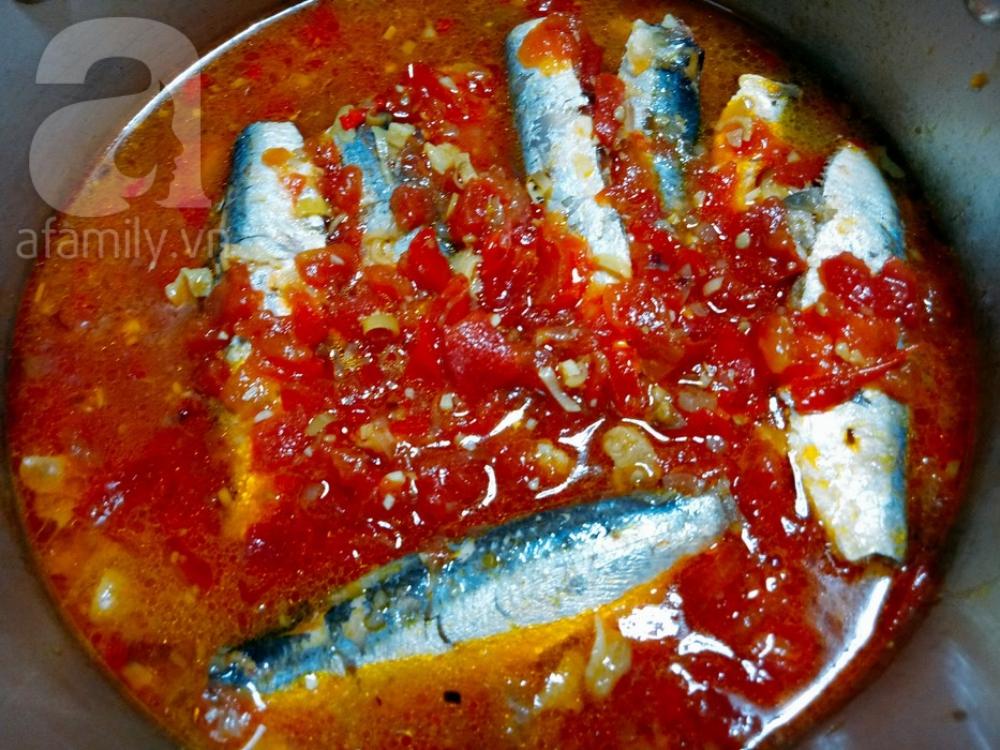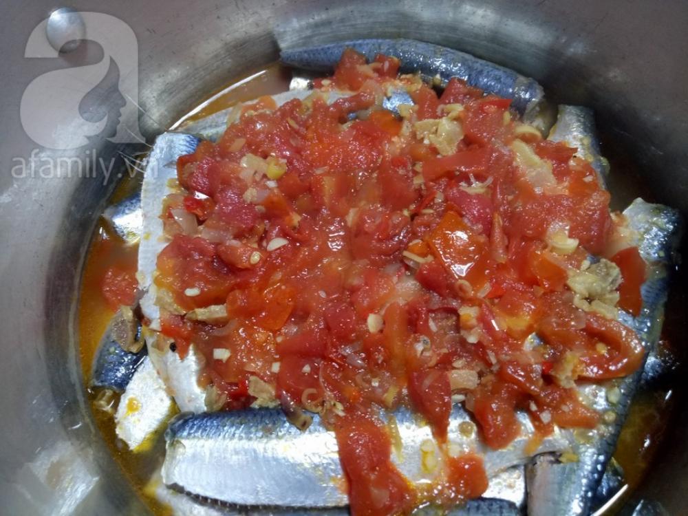 Xếp cá trích vào nồi, rồi cho ½ nước sốt cà vào cá. Kho cá trên lửa nhỏ liu riu khoảng 30 phút.