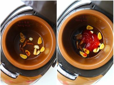 Cho nước sốt cà chua, 300ml nước vào nồi cơm điện, khuấy đều.