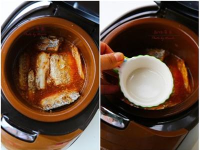Cho cá vào rồi nhấn nút nấu. Khi nước sôi lăn tăn thì cho 5g bột bắp vào khuấy