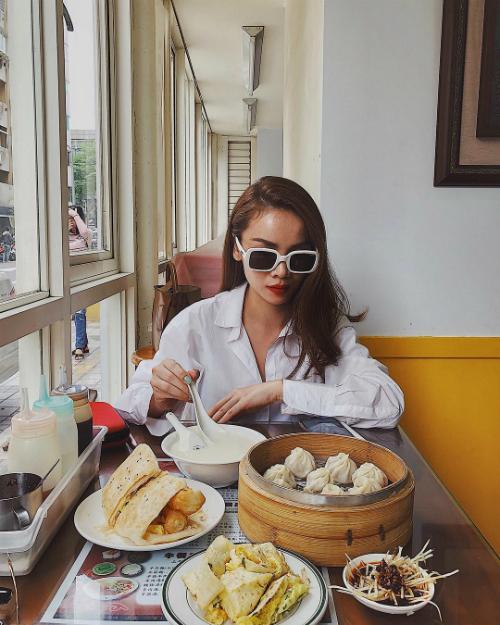 Yến Nhi chia sẻ: "Tụi mình đi du lịch nước ngoài hay tìm những quán địa phương đặc biệt, chỉ người địa phương ăn là chủ yếu. Vì thế, chuyến đi này sẽ khám phá thêm vài nơi và chia sẻ cho mọi người". Ngay ngày đầu tiên khi đến Đài Bắc, hai người đẹp đã thưởng thức ngay các món ăn sáng đặc trưng ở xứ Đài như bánh xiaolongbao, bánh bao, bánh rán hay mì bò trứ danh. "Bữa ăn hơi nhiều bột nhưng nói chung là ăn ngon, không bị ngán mà no vì tụi mình gọi nhiều món để nghiên cứu. Vị không quá đậm, rất vừa miệng. Mỗi món ăn có giá từ 28 Đài tệ đến 210 Đài tệ", người đẹp bật mí.