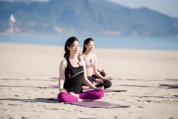 Các thí sinh chào ngày mới trên biển Quy Nhơn bằng những động tác yoga khỏe khắn, dẻo dai dưới sự hướng dẫn của chuyên gia. Hít thở không khí trong lành, giữa khung cảnh thiên nhiên khoáng đãng, giúp các người đẹp “nạp” năng lượng, sẵn sàng cho một ngày mới năng động.