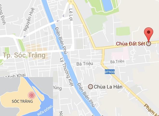Ngôi nhà phát hiện thi thể bốc mùi hôi cách chùa Đất Sét ở Sóc Trăng khoảng 300 m. Ảnh: Google Maps.
