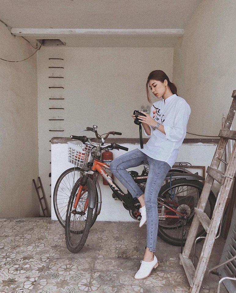 Đồng Ánh Quỳnh khoe street style giản dị vẫn đẹp bất chấp cùng áo cổ tàu kết hợp quần jeans, giày oxford.