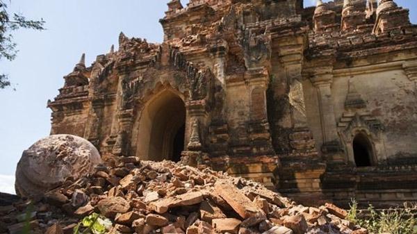 Một trận động đất khác mạnh gần 7 độ Richter xảy ra gần thánh địa Bagan, vùng di tích nổi tiếng với hơn 2.500 chùa cổ của Myanmar, làm 3 người tử vong, gây hư hại nghiêm trọng đến nhiều công trình tôn giáo lịch sử ở vùng này. Ảnh: Getty