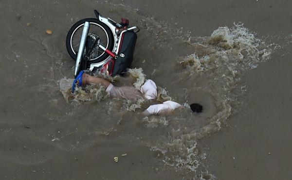 Người đàn ông đi xe máy ngã sõng soài giữa dòng nước lũ vì mưa lớn ở thành phố Lahore, Pakistan, ngày 25/8. Ảnh: Getty
