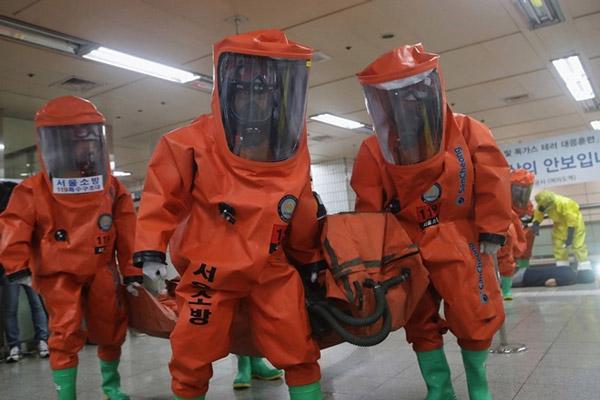 Các nhân viên cứu hộ khẩn cấp mặc quần áo bảo hộ tham gia diễn tập chống khủng bố và tấn công bằng vũ khí hóa học trong khuôn khổ cuộc tập trận chung thường niên giữa Mỹ và Hàn Quốc. Cuộc tập trận mang tên Ulchi Freedom Guardian (UFG) tại ga tàu điện ngầm Yeoui, thủ đô Seoul, Hàn Quốc, ngày 23/8. Ảnh: Getty
