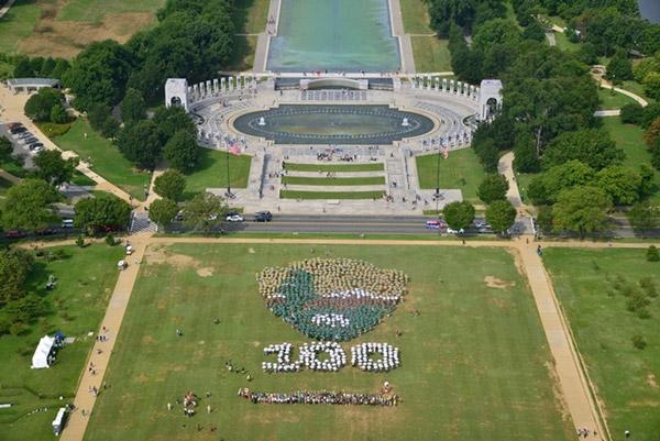 Người dân tập trung xếp hình ở khu National Mall tại thủ đô Washington, Mỹ, hướng về phía Đài tưởng niệm Chiến tranh Thế giới II. Biểu tượng công viên Quốc gia Mỹ hiện lên đầy sống động qua những gam màu như nâu, trắng và xanh lá cây. Ảnh: National Park Service