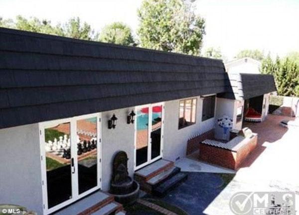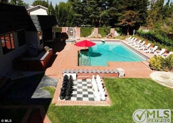 Sân sau của ngôi nhà có một bể bơi và bàn cờ vua lớn.