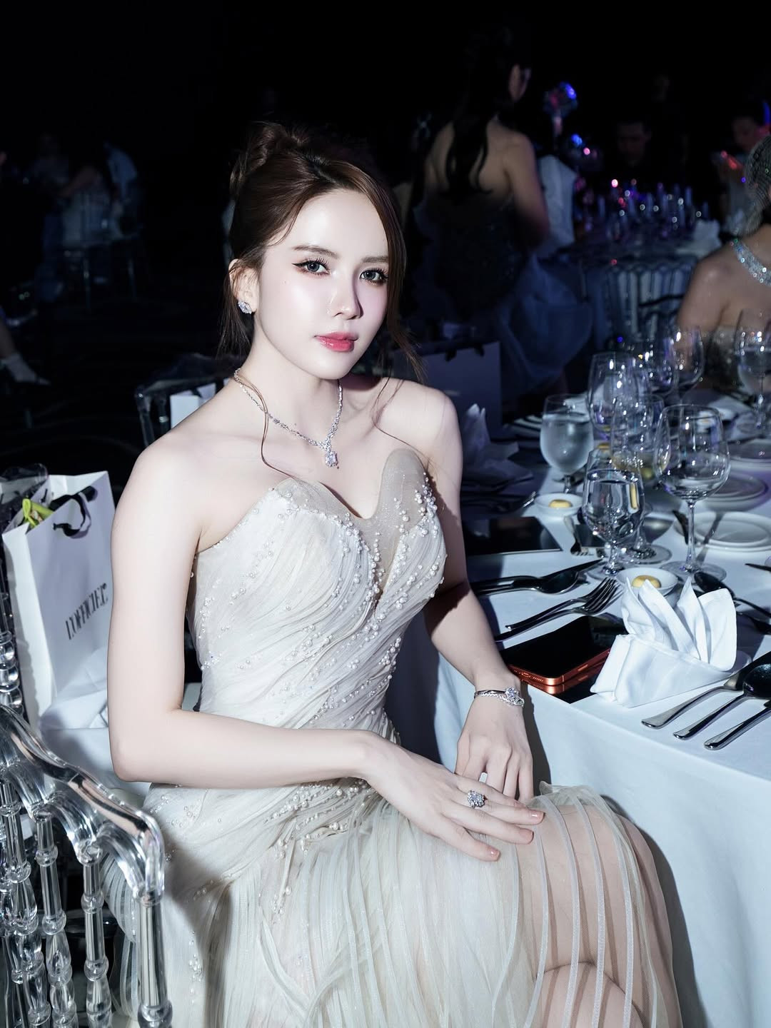 Xuất hiện ở sự kiện, nữ ca sĩ diện chiếc đầm đuôi cá phom cúp ngực với những đường xếp vải tinh tế tôn trọn vóc dáng cùng làn da trắng nõn nà. Người đẹp lựa chọn kiểu tóc búi rối khoe trọn visual căng mướt cùng lớp trang điểm nền nã, xinh đẹp.
