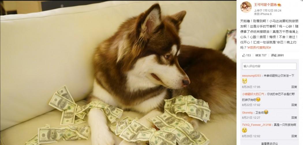 Tài khoản weibo đăng ảnh chú cún cưng nằm trên đống tiền đô la