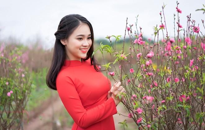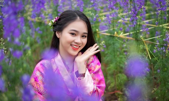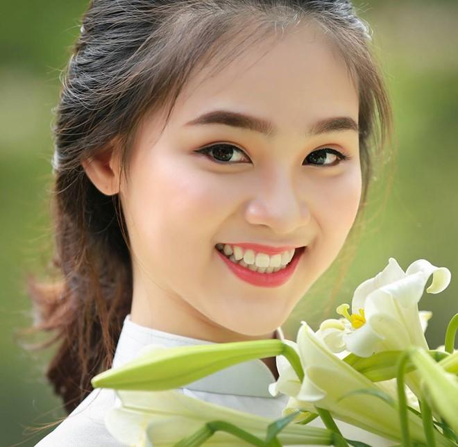 Trong tà áo dài trắng, cô gái trang điểm đơn giản, ôm bó hoa vào lòng và nở nụ cười tươi. Gương mặt thanh tú, ánh mắt trong veo, vẻ đẹp dịu dàng của cô nhanh chóng ghi điểm với nhiều người.